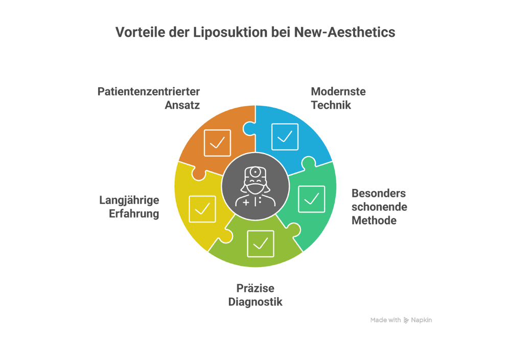 • Die Liposuktion bringt medizinische und ästhetische Vorteile: Sie entfernt krankhafte Fettzellen, lindert Beschwerden und verbessert sichtbar die Hautstruktur – auch bei reiner Cellulite